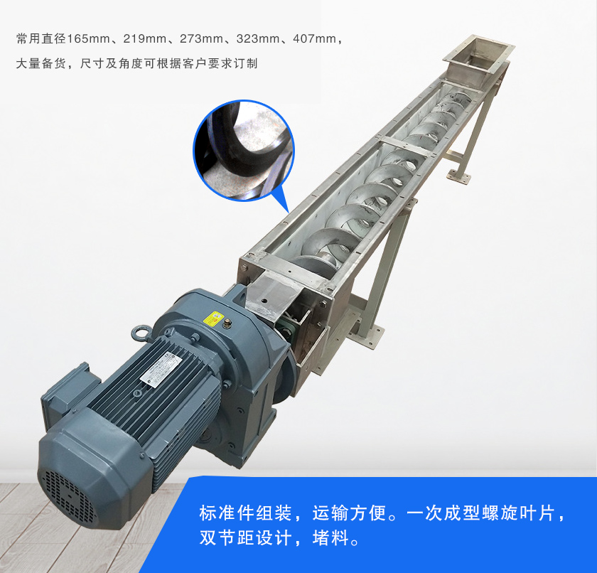 1、粉煤(méi)灰螺旋輸送機的整體扭矩更大且(qiě)采用變螺距設(shè)計,進料端螺距小於出(chū)料端螺距,俗稱"吃得少,吐(tǔ)得快",能夠有效防止粉煤灰堵塞。