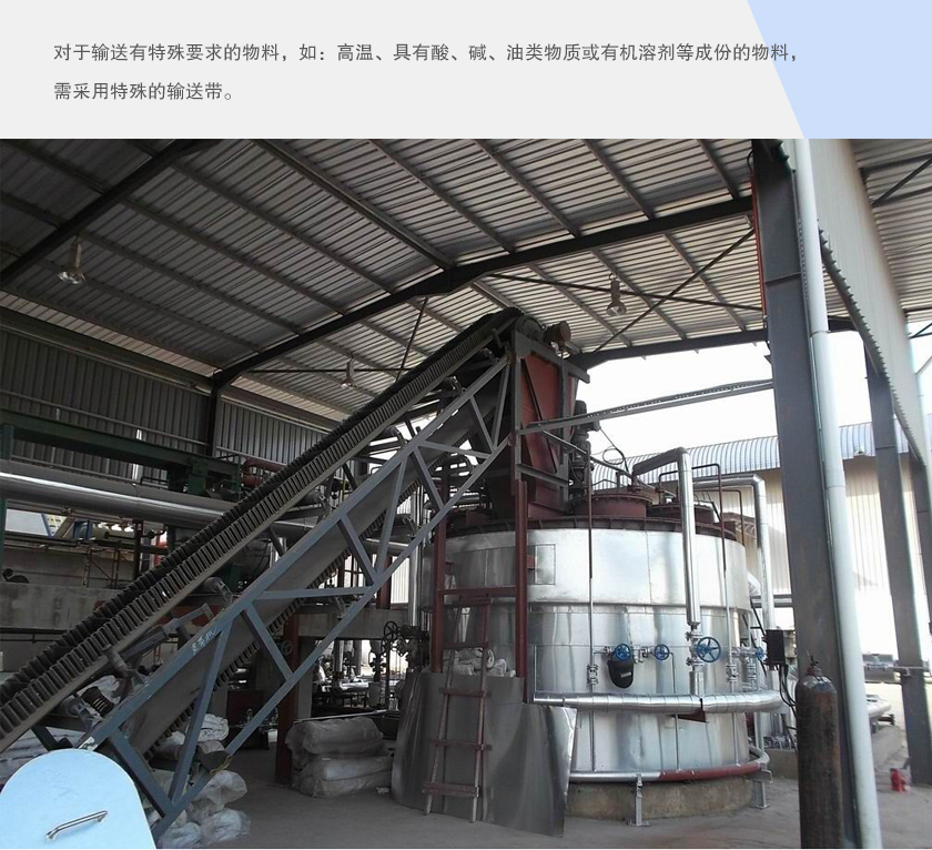 3、對於輸送(sòng)有特殊要求的物料,如:高溫、具(jù)有酸、堿(jiǎn)、油類(lèi)物質或有機溶劑等成份的物(wù)料,需采用特殊的輸送帶。